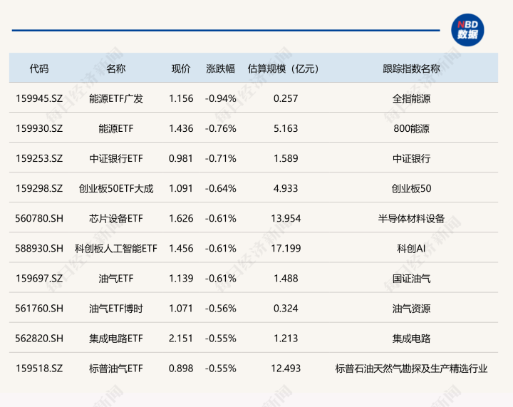下跌方面,能源相关ETF跌幅居前。